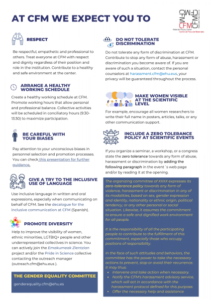 In mid-2018, the initial phase of the design of the CFM GEP began, which corresponds to the pre-diagnosis of the centerās gender situation. In 2019, a gender equality committee was established at the center, made up of researchers, relevant administrative personnel, and the management team. This committee, accompanied and advised at all times by the techniques of Elhuyar aholkularitza, worked on the evaluation of data from the CFM, obtained from the surveys carried out and the extensive work of compiling indicators and documentation carried out in CFM.Throughout 2019, the GEP was shaped as a specific and exclusive plan of CFM, which reflects the general situation, and brings together all the commitments, actions and will of CFM to cover gender equality in our institution in all its breadth. At the beginning of 2020, after assuming the changes in the management team, the gender commission was re-es-tablished and will be responsible of launching and implementing this plan in the period 2020-2024.