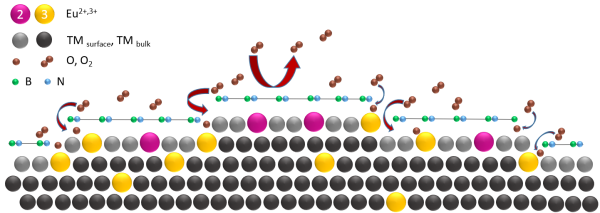 A schematic diagram depicts the exposure of an Eu-transition metal (TM) surface alloy beneath a protective layer of hBN to ambient conditions.