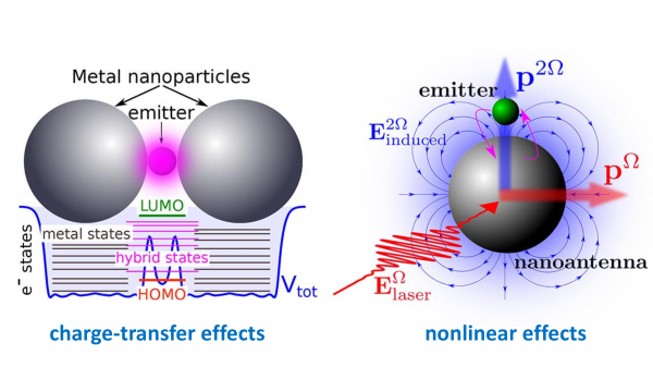 This thesis theoretically addresses the optoelectronic response of metallic nanoparticles (MNPs) and their coupling to quantum emitters (QEs). Nanometer-scale systems are considered where optical nonlinearity, nonlocality, or electron-transfer processes can all play an important role. To capture these quantum many-body effects, Time-Dependent Density Functional Theory (TDDFT) is used primarily in combination with semiclassical models based on the Surface-Response Formalism (SRF) and classical calculations based on the Local-Response Approximation (LRA). We demonstrate that, at the nanometer scale, electron spill-out of the induced charges and surface-enabled Landau damping drastically influence the electromagnetic interaction between MNPs and QEs. In addition, we predict that the hybridization between the electronic states of the QE and those of the MNPs drastically modifies the optical response of the coupled system in situations involving subnanometric distances. Finally, we demonstrate that the electromagnetic coupling of a QE to a spherical MNP can also affect the nonlinear optical response of the system, enabling otherwise-forbidden second-harmonic generation (SHG). The content of this thesis thus presents a quantum mechanical many-body approach to the optical response of plasmonic cavities, which provides new insights into coupling with emitters, electron transfer processes and nonlinear effects.