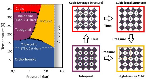 (Left) P−T phase diagram of MAPbI3. (Right) Selected projections of the structures of these phases.