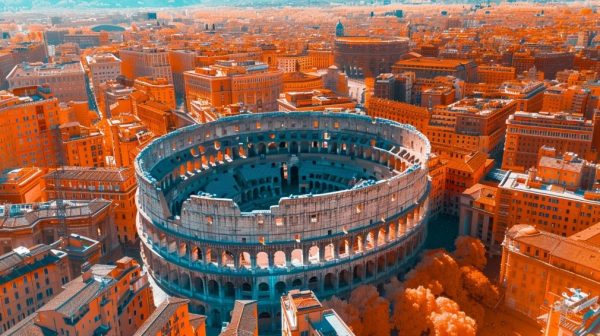 An artistic depiction of the Colosseum—a symbol of Roman engineering—reimagined within an overheated urban landscape. The image serves as a visual metaphor for ‘Coolcrete,’ a modern concrete inspired by Roman innovation, designed with daytime radiative cooling properties. By lowering surface temperatures and reducing cooling energy demand, Coolcrete presents a powerful opportunity for energy savings and offers a promising solution to mitigate the Urban Heat Island effect.
