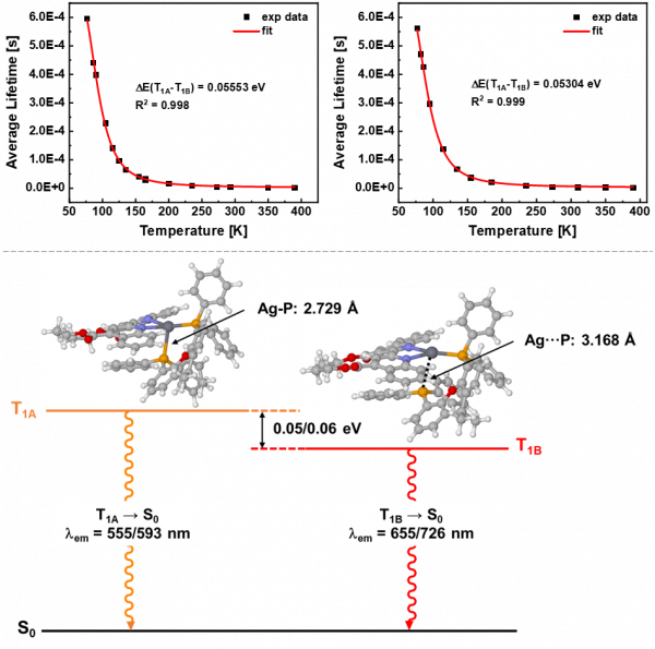 Figure: Schematic representation of the equilibrium structures of the triplet excited states of [Ag(Xantphos)(deebq)] involved in the emission process, the experimentally obtained/calculated values of the emission wavelengths and the energy gap highlighting the thermal equilibration situation responsible for the dual phosphorescence observed in this system.